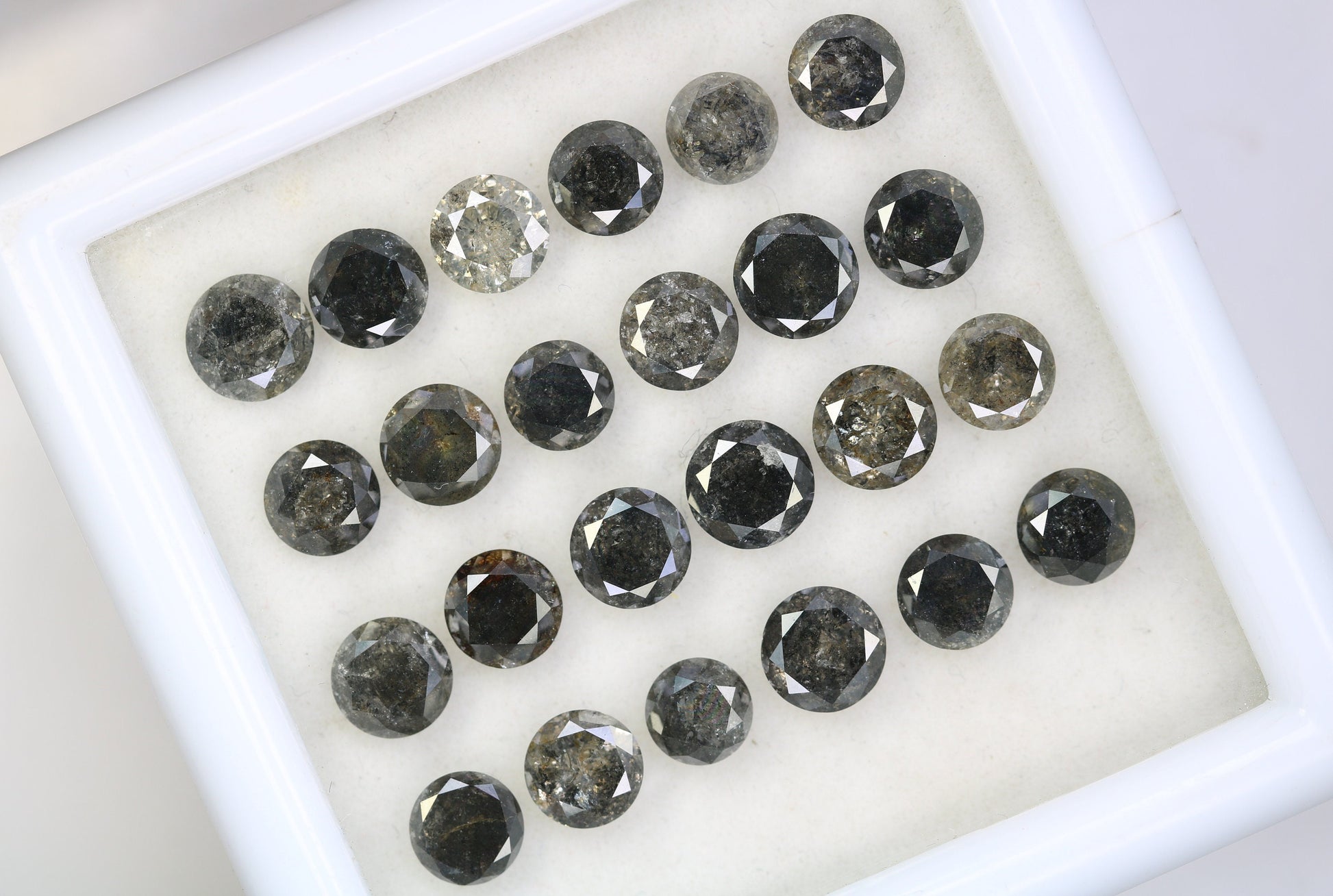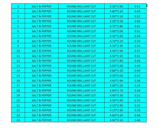 Shape :- Round Brilliant Cut Color :- Salt And Pepper Clarity :- I3 Pieces :- 24 pcs Use :- Customize ring / Engagement Ring , Necklace , Earring , Bracelet and Wedding Rings1 SALT & PEPPER ROUND BRILLIANT 5.70*3.00 0.67 2 SALT & PEPPER ROUND BRILLIANT 5.30*3.60 0.68 3 SALT & PEPPER ROUND BRILLIANT 5.30*3.00 0.53 4 SALT & PEPPER ROUND BRILLIANT 5.10*3.50 0.60 5 SALT & PEPPER ROUND BRILLIANT 5.00*3.70 0.67 6 SALT & PEPPER ROUND BRILLIANT 5.10*3.30 0.57 7 SALT & PEPPER ROUND BRILLIANT 5.20*3.10 0.58 8 SALT & PEPPER ROUND BRILLIANT 5.40*3.30 0.65 9 SALT & PEPPER ROUND BRILLIANT 5.90*3.60 0.57 10 SALT & PEPPER ROUND BRILLIANT 5.30*2.80 0.52 11 SALT & PEPPER ROUND BRILLIANT 5.50*2.80 0.60 12 SALT & PEPPER ROUND BRILLIANT 5.30*3.40 0.64 13 SALT & PEPPER ROUND BRILLIANT 5.40*3.60 0.69 14 SALT & PEPPER ROUND BRILLIANT 5.20*3.50 0.65 15 SALT & PEPPER ROUND BRILLIANT 5.30*3.50 0.64 16 SALT & PEPPER ROUND BRILLIANT 5.70*2.70 0.60 17 SALT & PEPPER ROUND BRILLIANT 3.50*3.00 0.59 18 SALT & PEPPER ROUND BRILLIANT 5.20*3.20 0.56 19 SALT & PEPPER ROUND BRILLIANT 5.10*3.30 0.55 20 SALT & PEPPER ROUND BRILLIANT 5.30*3.00 0.52 21 SALT & PEPPER ROUND BRILLIANT 4.80*3.50 0.51 22 SALT & PEPPER ROUND BRILLIANT 5.60*3.00 0.68 23 SALT & PEPPER ROUND BRILLIANT 5.10*3.20 0.57 24 SALT & PEPPER ROUND BRILLIANT 5.20*3.80 0.69𝐖𝐞 𝐀𝐫𝐞 𝐌𝐚𝐧𝐮𝐟𝐚𝐜𝐭𝐮𝐫𝐞𝐫 𝐎𝐟 𝐀𝐥𝐥 𝐓𝐲𝐩𝐞𝐬 𝐎𝐟 𝐍𝐚𝐭𝐮𝐫𝐚𝐥 𝐃𝐢𝐚𝐦𝐨𝐧𝐝𝐬. 💎 𝐖𝐞 𝐚𝐫𝐞 𝐚𝐛𝐥𝐞 𝐭𝐨 𝐦𝐚𝐤𝐞 𝐜𝐮𝐬𝐭𝐨𝐦 𝐦𝐚𝐝𝐞 𝐝𝐢𝐚𝐦𝐨𝐧𝐝𝐬 𝐚𝐧𝐝 𝐣𝐞𝐰𝐞𝐥𝐫𝐲 𝐚𝐬 𝐩𝐞𝐫 𝐜𝐥𝐢𝐞𝐧𝐭'𝐬 𝐫𝐞𝐪𝐮𝐢𝐫𝐞𝐦𝐞𝐧𝐭𝐬. 𝐇𝐢𝐭 𝐭𝐡𝐞 𝐦𝐞𝐬𝐬𝐚𝐠𝐞 𝐛𝐮𝐭𝐭𝐨𝐧 𝐭𝐨 𝐫𝐞𝐚𝐜𝐡 𝐨𝐮𝐭 𝐭𝐨 𝐮𝐬 𝐢𝐟 𝐲𝐨𝐮 𝐡𝐚𝐯𝐞 𝐚𝐧𝐲 𝐬𝐩𝐞𝐜𝐢𝐟𝐢𝐜 𝐫𝐞𝐪𝐮𝐢𝐫𝐞𝐦𝐞𝐧𝐭𝐬 𝐨𝐫 𝐥𝐨𝐨𝐤𝐢𝐧𝐠 𝐟𝐨𝐫 𝐚𝐧𝐲 𝐬𝐩𝐞𝐜𝐢𝐟𝐢𝐜 𝐬𝐢𝐳𝐞 𝐨𝐧 𝐝𝐢𝐚𝐦𝐨𝐧𝐝𝐬 𝐚𝐧𝐝 𝐣𝐞𝐰𝐞𝐥𝐫𝐲.𝐏𝐚𝐲𝐦𝐞𝐧𝐭 :- (1) We Accept PayPal As Payment Mode. (2) Any Other Payment Mode Like Net Banking, Debit Card, Credit Card, Contact Us Freely (3) We have an Installment facility available for more than 500 $ payment as per customer demand (4) We have also Hold a diamond facility for those who want to pay after some days𝐒𝐡𝐢𝐩𝐩𝐢𝐧𝐠 𝐏𝐨𝐥𝐢𝐜𝐲 :- 1. We take 1 To 2 Business Day For Handling Time 2.Normal Free Shipment Take 12 to 15 Working Days. 3.Express Shipment Take 5 to 6 Working Days. 4. Tracking Details Update after 2 days of shipment. 5.Custom Order Take More Days For Handling Time. 6. Please, Leave Your Contact No. For Shipping purpose.𝐑𝐞𝐭𝐮𝐫𝐧𝐬 𝐚𝐧𝐝 𝐞𝐱𝐜𝐡𝐚𝐧𝐠𝐞𝐬 :- I gladly accept returns, exchanges and cancellations Contact me within: 7 days of delivery Dispatch items back within: 30 days of delivery Request a cancellation within: 2 days of purchase𝐇𝐨𝐰 𝐭𝐨 𝐎𝐫𝐝𝐞𝐫 𝐂𝐮𝐬𝐭𝐨𝐦 𝐉𝐞𝐰𝐞𝐥𝐥𝐞𝐫𝐲 ?? Do you looking special and unique piece ? Do you have pictures, sketch or just idea ? Just Send Us! Let's design together and create the jewel of your dreams with best prices. We will make the first cad design for you and sent it to you for confirmation. After confirming your Cad design, we again sent it to the making jewelry factory. After Ready jewelry, we will send you a ready jewelry photo for confirmation and ship it to you.𝑽𝒊𝒔𝒊𝒕 𝑺𝒕𝒐𝒓𝒆 :- https://www.etsy.com/shop/Rocksdiamond* How to Order* Browse Our Collection: Explore our range of natural diamonds, salt and pepper diamonds, gemstones, and handcrafted jewelry.Select Your Item: Click on your desired product to view details, including size, shape, and pricing.Add to Cart: Once you've made your selection, click "Add to Cart." You can adjust quantities or add additional items as needed.Checkout: When you're ready, click on your cart and proceed to checkout.Custom Orders Personalization Available: If you’d like a custom design or a specific gemstone, please contact us before placing your order.Consultation: We’ll work with you to understand your vision and provide a quote based on your requirements. Design Approval: Once we finalize the design, we’ll send you a confirmation before beginning the crafting process.ShippingProcessing Time: Orders typically ship within [1-3 days]. Custom orders may take longer; we’ll keep you updated on the timeline. Shipping Methods: We offer [standard/express] shipping options. Tracking information will be provided once your order ships. International Shipping: We happily ship worldwide. Please note that customs duties may apply depending on your location.Payment Secure Payments: We accept various payment methods, including credit/debit cards and PayPal, ensuring a safe and secure checkout experience. Payment Plans: For high-value items, we may offer flexible payment plans. Please inquire for details.Customer Support Questions? If you have any questions or need assistance, feel free to reach out via Etsy messages. We’re here to help!Customer Satisfaction: Your happiness is our priority. If you have any concerns about your order, please contact us, and we’ll do our best to resolve any issues. Thank you for choosing Rocks Diamond! We look forward to helping you find or create the perfect piece of jewelry.Thank you for Vist : rocksdiamond.etsy.comComplete your search for the perfect gift at RocksDiamond. Whether it's personalized gifts, elegant jewelry, or unique Christmas ornaments, our collection of natural diamonds offers something special for everyone. Ideal for gifts for him, birthday