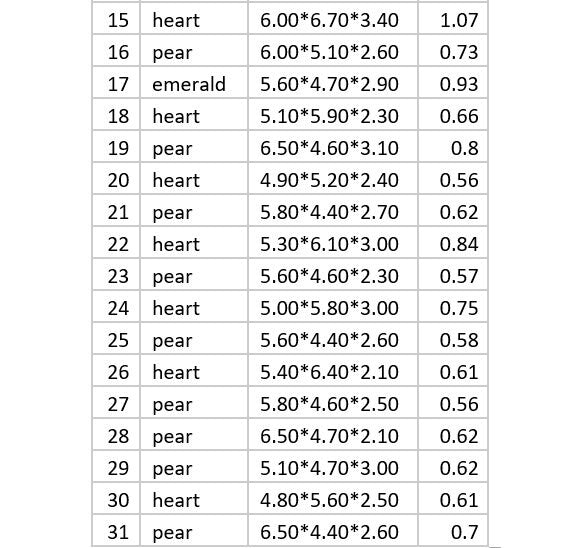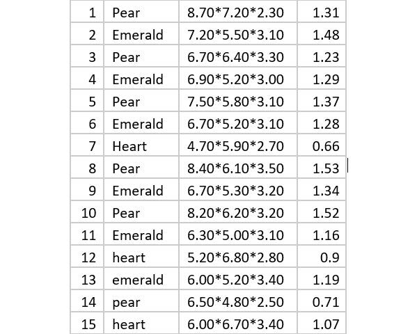 No. | Shape | Carat Weight | Dimensions (MM) | Type | Color | Cut | Treatment | Source | Use |