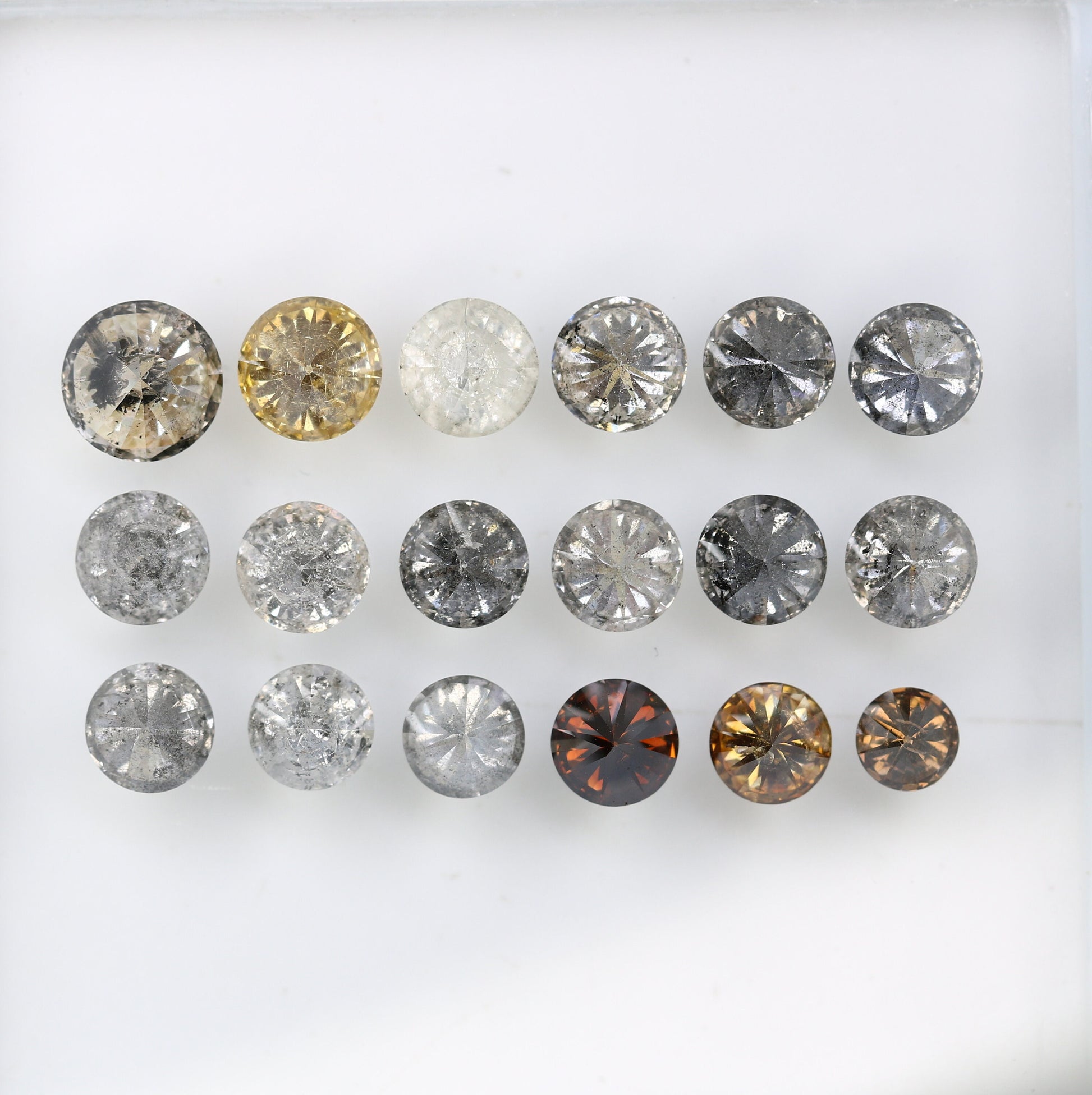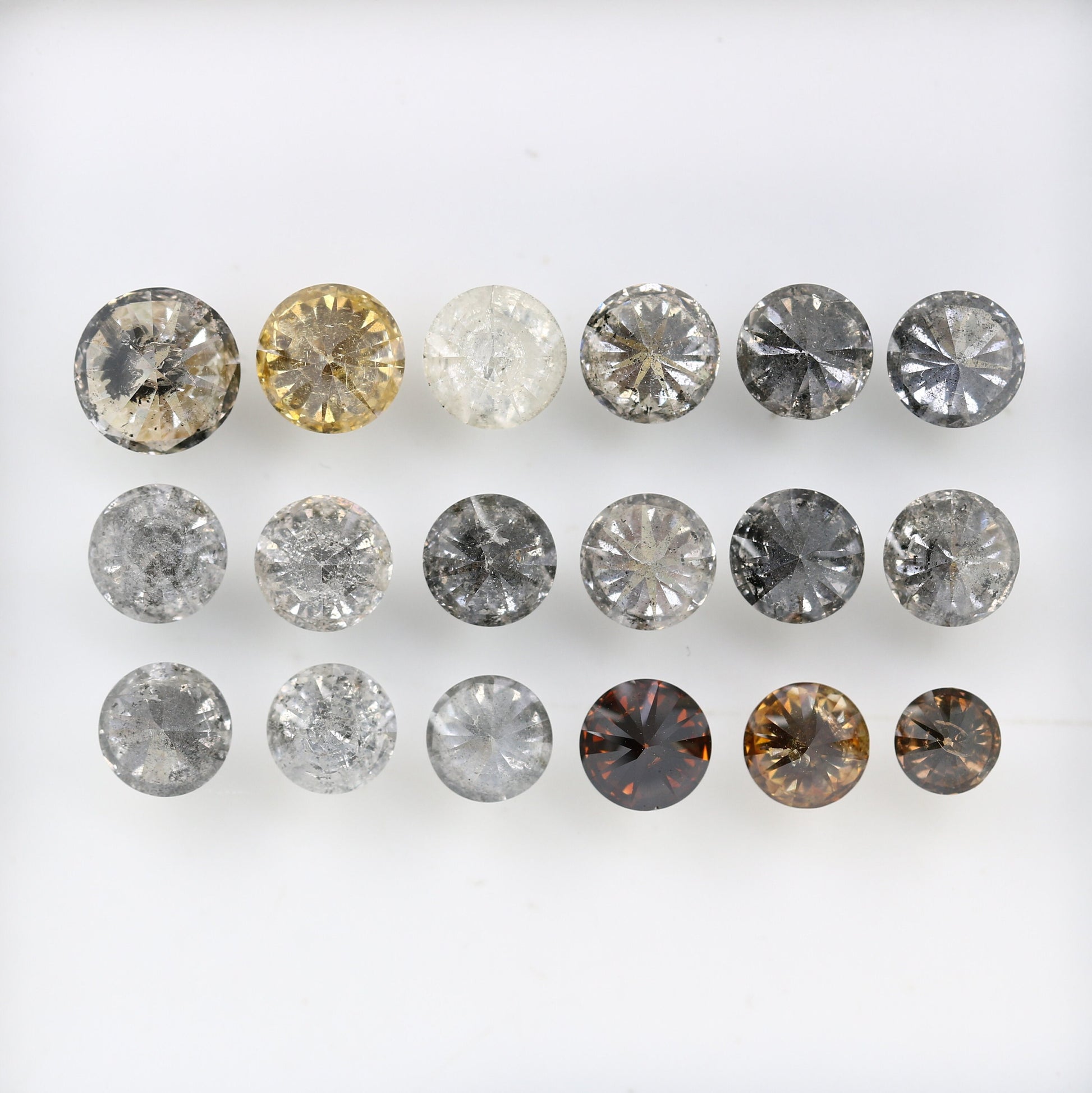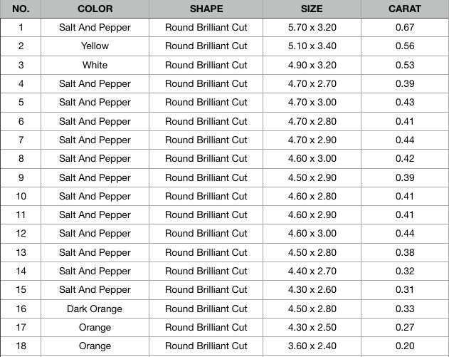 Shape :- Round Brilliant Cut Use :- Salt and Pepper Engagement Ringβ₯ ππ’ππ¦π¨π§ππ¬ πππππ’π₯π¬ π 1) Salt & Pepper 0.67 CT 5.70 x 3.20 MM 2) Yellow 0.56 CT 5.10 x 3.40 MM 3) White 0.53 CT 4.90 x 3.20 MM 4) Salt & Pepper 0.39 CT 4.70 x 2.70 MM 5) Salt & Pepper 0.43 CT 4.70 x 3.00 MM 6) Salt & Pepper 0.41 CT 4.70 x 2.80 MM 7) Salt & Pepper 0.44 CT 4.70 x 2.90 MM 8) Salt & Pepper 0.42 CT 4.60 x 3.00 MM 9) Salt & Pepper 0.39 CT 4.50 x 2.90 MM 10) Salt & Pepper 0.41 CT 4.60 x 2.80 MM 11) Salt & Pepper 0.41 CT 4.60 x 2.90 MM 12) Salt & Pepper 0.44 CT 4.60 x 3.00 MM 13) Salt & Pepper 0.38 CT 4.50 x 2.80 MM 14) Salt & Pepper 0.32 CT 4.40 x 2.70 MM 15) Salt & Pepper 0.31 CT 4.30 x 2.60 MM 16) Dark Orange 0.33 CT 4.50 x 2.80 MM 17) Orange 0.27 CT 4.30 x 2.50 MM 18) Orange 0.20 CT 3.60 x 2.40 MM https://rocksdiamond.etsy.comThank You For Reach out RocksDiamond rocksdiamond.etsy.com Hello Friends,Welcome to Rocks Diamond, the complete store of Natural and Salt Pepper Diamonds, Rough Diamonds, gemstones, beads and high quality jewelry supplies with therapeutic values. * How to Order* Browse Our Collection: Explore our range of natural diamonds, salt and pepper diamonds, gemstones, and handcrafted jewelry.Select Your Item: Click on your desired product to view details, including size, shape, and pricing.Add to Cart: Once you've made your selection, click "Add to Cart." You can adjust quantities or add additional items as needed.Checkout: When you're ready, click on your cart and proceed to checkout.Custom Orders Personalization Available: If youβd like a custom design or a specific gemstone, please contact us before placing your order.Consultation: Weβll work with you to understand your vision and provide a quote based on your requirements. Design Approval: Once we finalize the design, weβll send you a confirmation before beginning the crafting process.ShippingProcessing Time: Orders typically ship within [1-3 days]. Custom orders may take longer; weβll keep you updated on the timeline. Shipping Methods: We offer [standard/express] shipping options. Tracking information will be provided once your order ships. International Shipping: We happily ship worldwide. Please note that customs duties may apply depending on your location.Payment Secure Payments: We accept various payment methods, including credit/debit cards and PayPal, ensuring a safe and secure checkout experience. Payment Plans: For high-value items, we may offer flexible payment plans. Please inquire for details.Customer Support Questions? If you have any questions or need assistance, feel free to reach out via Etsy messages. Weβre here to help!Customer Satisfaction: Your happiness is our priority. If you have any concerns about your order, please contact us, and weβll do our best to resolve any issues. Thank you for choosing Rocks Diamond! We look forward to helping you find or create the perfect piece of jewelry.Thank you for Vist : rocksdiamond.etsy.comComplete your search for the perfect gift at RocksDiamond. Whether it's personalized gifts, elegant jewelry, or unique Christmas ornaments, our collection of natural diamonds offers something special for everyone. Ideal for gifts for him, birthday gifts, or the best gifts for her, every piece is crafted to make your moments unforgettable.